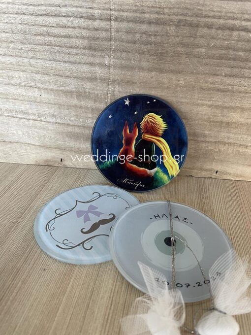 Μπομπονιέρα γυάλινο σουβέρ διάστασης 10εκ., με εκτύπωση της επιλογής μας. Το σουβέρ είναι πάχους 2 χιλιοστών. Η εκτύπωση μπορεί να έχει ό,τι θεματολογία και όνομα επιλέξετε φυσικά και η μακέτα φτιάχνεται κατόπιν συννενόησης. Τα κουφέτα τοποθετούνται μέσα σε τούλι και δένονται στο σουβέρ.