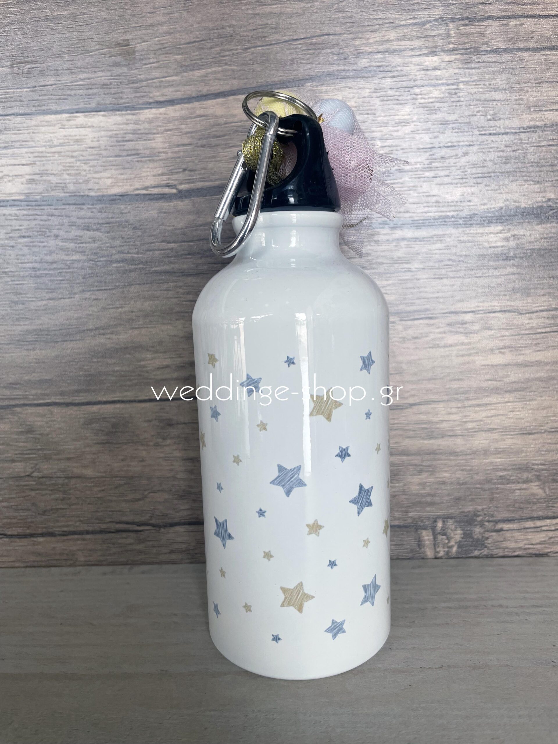 Μπομπονιέρα μεταλλικό παγουρίνο 400ml με ύψος 17,5εκ., με εκτύπωση της επιλογής μας. Η εκτύπωση μπορεί να έχει ό,τι θεματολογία και όνομα επιλέξετε φυσικά και η μακέτα φτιάχνεται κατόπιν συννενόησης. Τα κουφέτα τοποθετούνται μέσα σε τούλι και δένονται στο καπάκι.