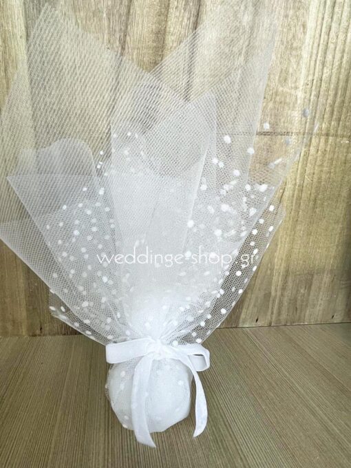 Μπομπονιέρα γάμου με λευκό μικρό πουά τούλι 33*33 και λευκό τούλι 40*40εκ., δεμένη με κορδέλα βελουτέ 1εκ. Τα κουφέτα είναι περιτυλιγμένα σε ένα μικρό τούλι.