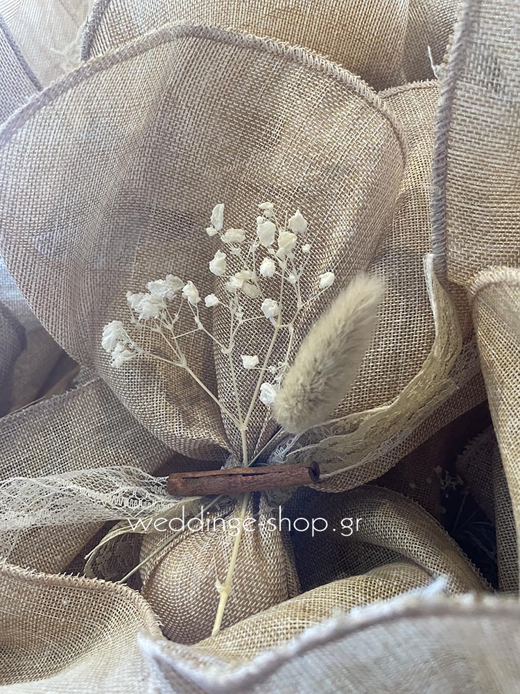Μπομπονιέρα από γάζα με κανέλα, bunny tail και αποξηραμένα λουλούδια